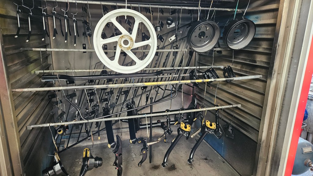 A new service we’re offering now is couriered parts. We have been doing it upon request for a while for some customers. If you have a batch of parts you can box them up and send it to us, in a way you would like them returned eg with enough space and packaging for items once they’re finished and need wrapping to protect them in transit. Send an order with a list of the parts, what finish you need and what you would like masking or any other points of consideration. We take care to mask the obvious as we are all into working with cars and bikes etc so know what’s needed. It may seem obvious to us all but we’ve seen other places powdercoat over bearing bores, brake surfaces, threads etc.