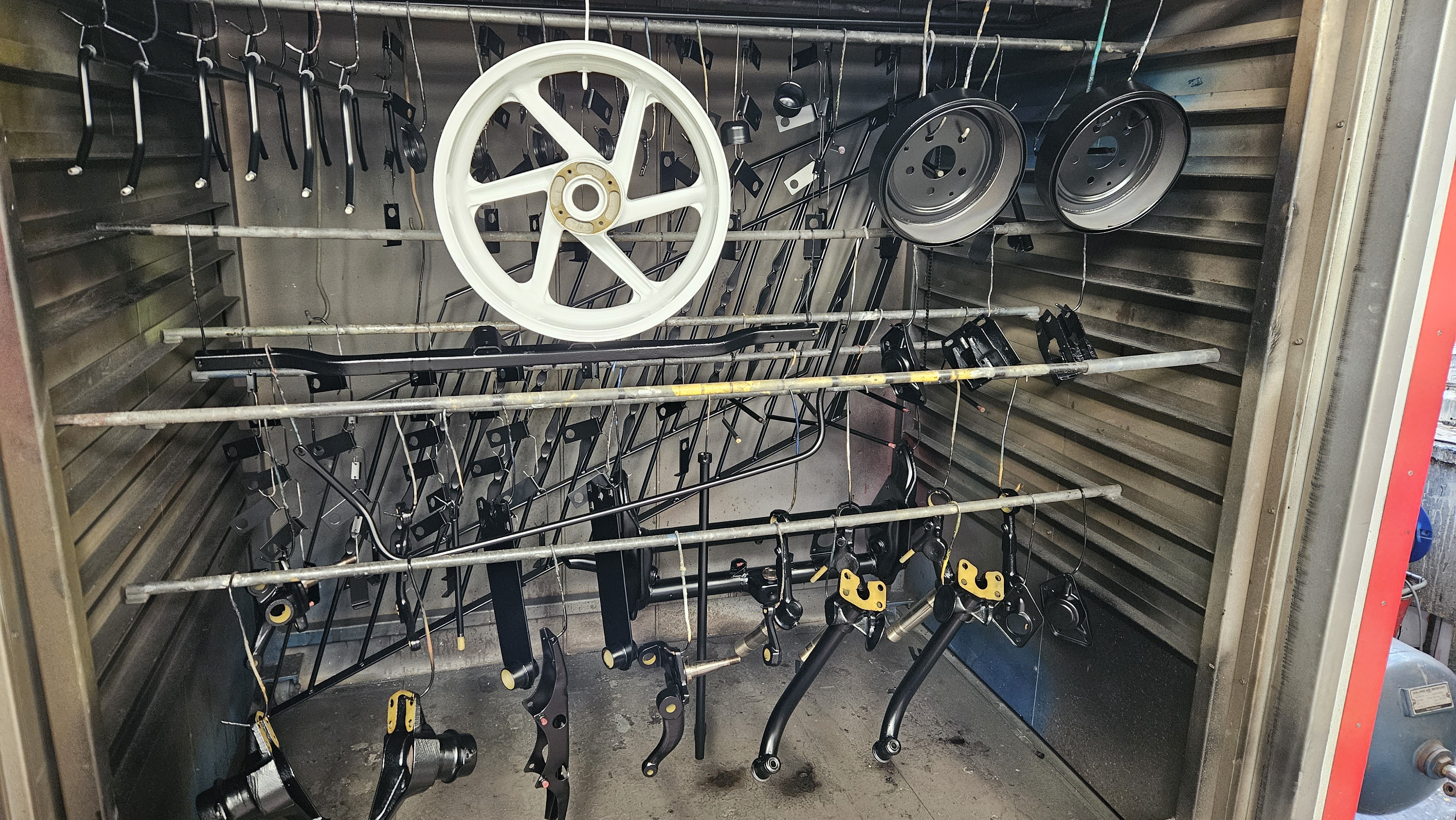 A new service we’re offering now is couriered parts. We have been doing it upon request for a while for some customers. If you have a batch of parts you can box them up and send it to us, in a way you would like them returned eg with enough space and packaging for items once they’re finished and need wrapping to protect them in transit. Send an order with a list of the parts, what finish you need and what you would like masking or any other points of consideration. We take care to mask the obvious as we are all into working with cars and bikes etc so know what’s needed. It may seem obvious to us all but we’ve seen other places powdercoat over bearing bores, brake surfaces, threads etc.